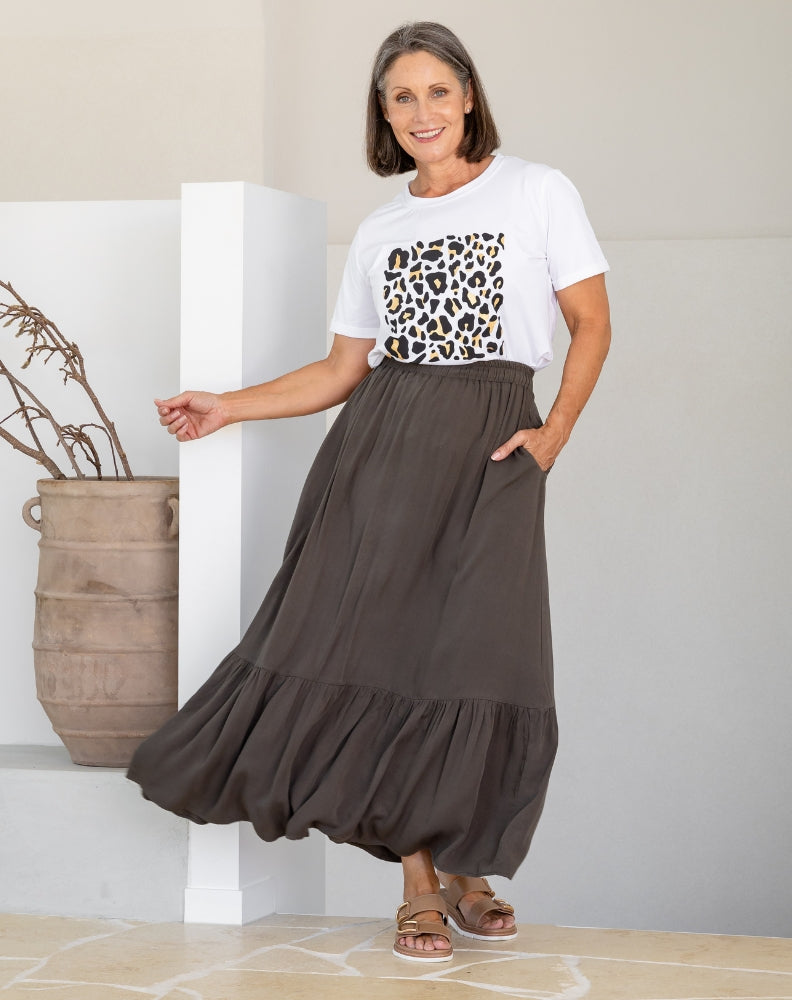 Effortlessly stylish and designed to flow with every step, the Danielle Maxi Skirt in Chocolate brings a playful yet polished touch to your wardrobe. It flows beautifully over the body without clinging. Dress it up or down — this maxi is a timeless wardrobe must-have.