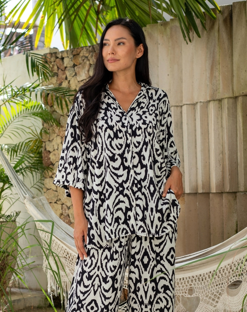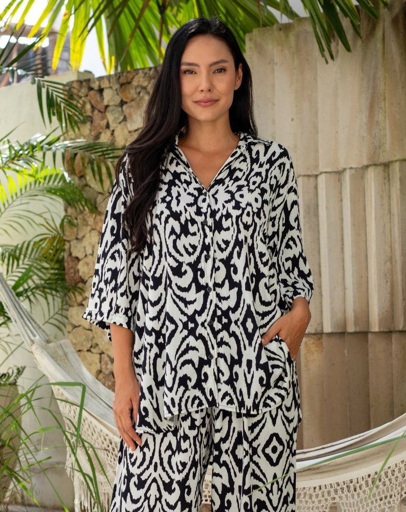 This relaxed & flowing shirt is fabricated in 100% rayon. Style casually with your favourite denim jeans. Or take your style to the next level by pairing with the matching wide leg Morgan Pants.