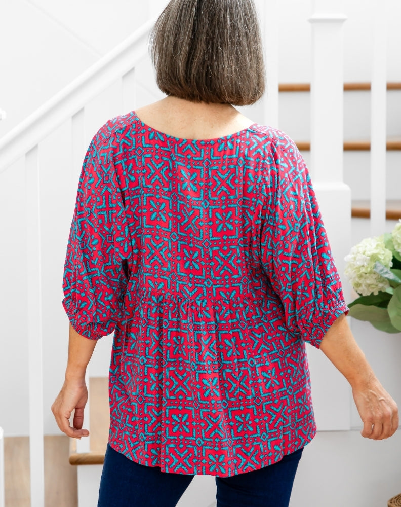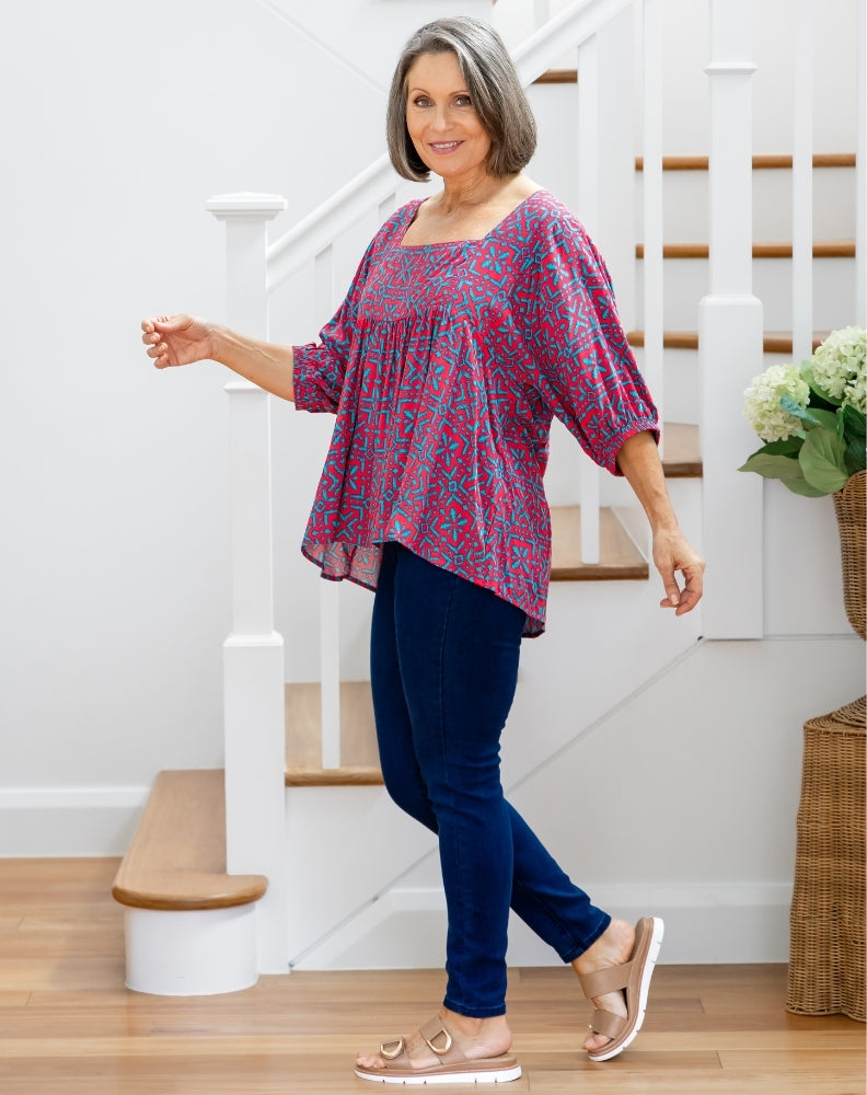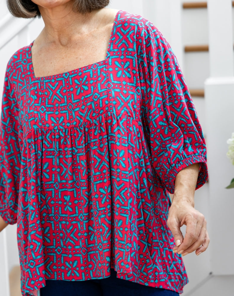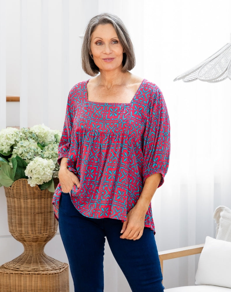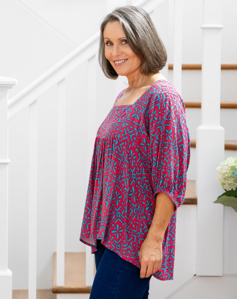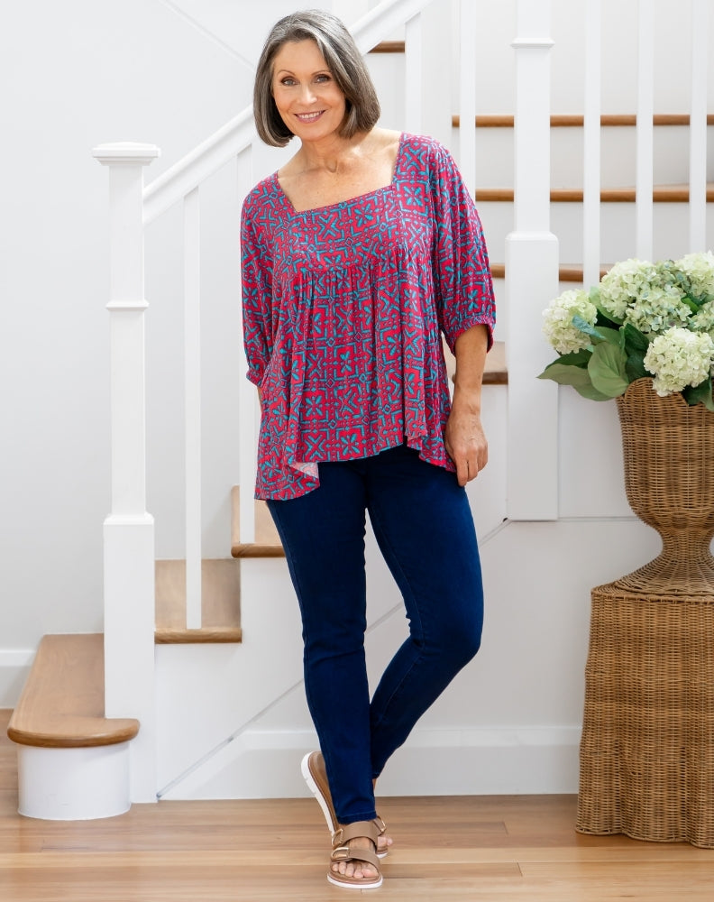Bright, bold and effortlessly fun – the Dahlia Top in our exclusive Watermelon Crush print is a true mood-booster. Pair it with your go-to denim or crisp white pants for a pop of colour that makes styling easy. Whether you're out for lunch or keeping it casual, this top brings playful polish to your everyday look.