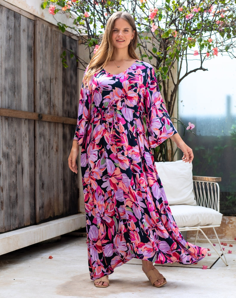 Our Zoe Maxi Dress is sure to attract many compliments!! Featuring statement wide sleeves, a drawstring tie to define the waist and a flowing skirt that skims over the hips. Style from casual to dressy with a simple change of accessories and shoes.